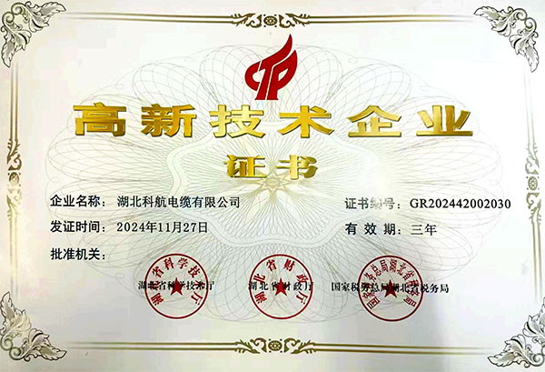 湖北科航电缆公司被认定为国家高新技术企业